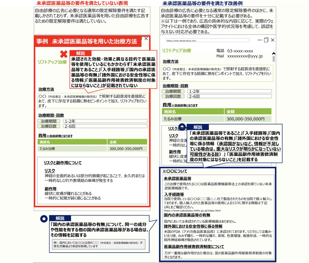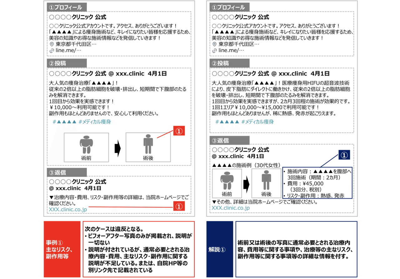 患者側が適切な判断できるようリスクや副作用等もわかりやすく記載する必要があります。