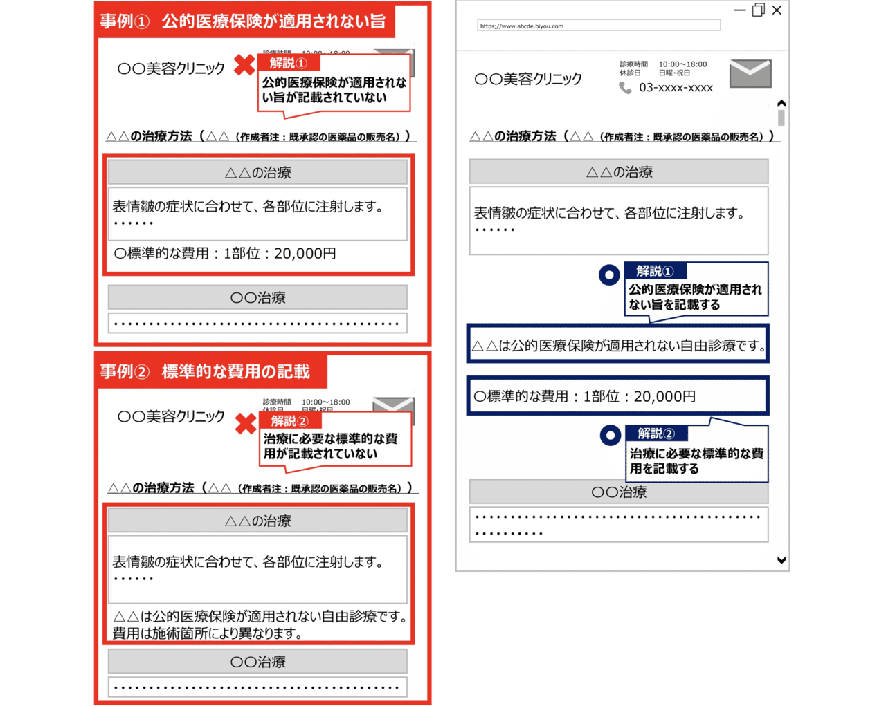医療機関と患者とのトラブルを防止するため、病院によって内容や費用が異なる自由診療は、治療の内容や費用等を具体的に掲載しようね、というお話しです。
