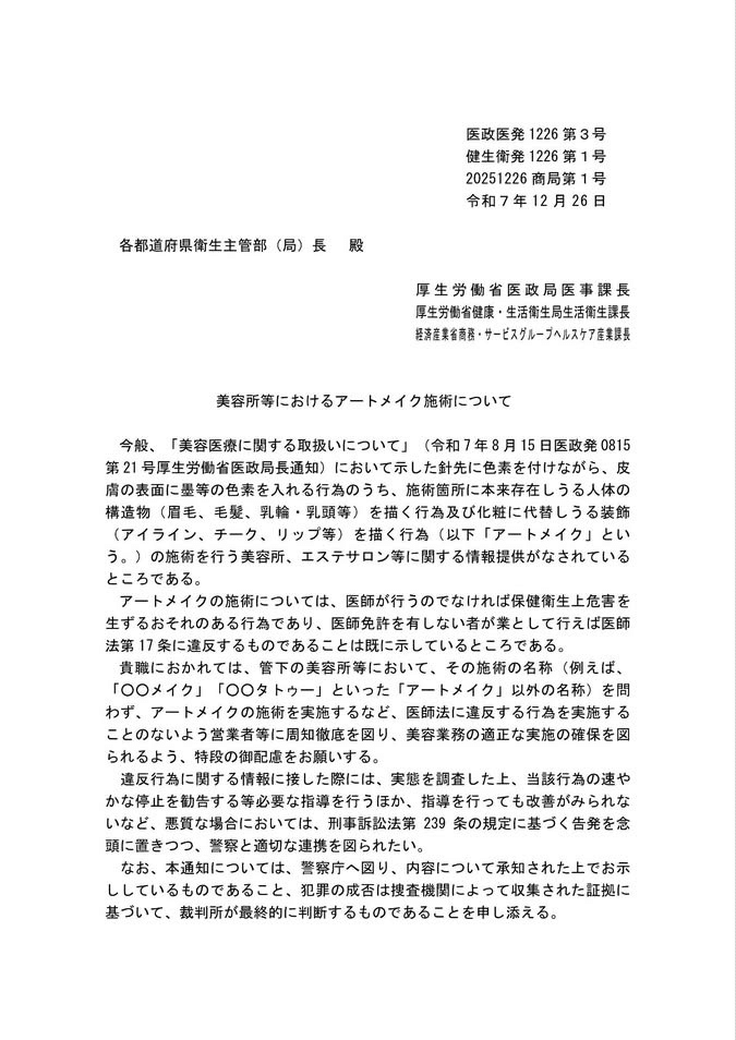 現在は、医師法違反が疑われるアートメイク施術について、